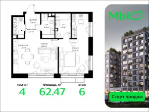 Старт продаж!В продаже квартира площадью 62.47 кв. м без отделки на 6 этаже 8 этажного дома. Квартира находится в премиальном жилом комплексе ''МЫС'' (Застройщик - MR Group).ЖК ''МЫС'' - идеальное место для тех, кто хочет объединить городскую жизнь с близостью к природе. Здесь каждый найдет формат жилья на свой вкус: многоквартирные и клубные дома для больших семей, ценящих приватность и простор, частные дома и таунхаусы для истинных фанатов загородной жизни, которые не готовы отказываться от городского комфорта. Расположение- 2 мин. до скоростной трассы М1 и Минского шоссе,- 10 мин. до МКАД,- 20 мин. до делового центра ''Москва-Сити'',- 25 мин. до ст. метро ''Рассказовка'',- 28 мин. до аэропорта ''Внуково''.Благоустройство- авторские лобби,- уютные зоны ожидания и библиотека,- велосипедные и лыжные маршруты,- собственная набережная и парк,- лаунж-зоны в окружении природы,- беседки у очага,- дворец спорта площадью 20 000 кв. м,- термальный комплекс с тремя бассейнами,- 4 теннисных и падел-корта,- 6 сквош-кортов,- многофункциональный спортзал,- скейт-парк,- просторная площадь для прогулок с фонтаном,- детский клуб с творческими секциями,- гастро-доминанта,- кафе у пруда, рестораны, ритейл.Окружение- соседство с лесным фондом,- школа на 1250 мест и 2 детских сада на 350 и 255 мест,- резерват ''Долина реки Вяземки'', Дубковский и Подушкинский леса, парк ''Рассказовка'', Мещерский парк.