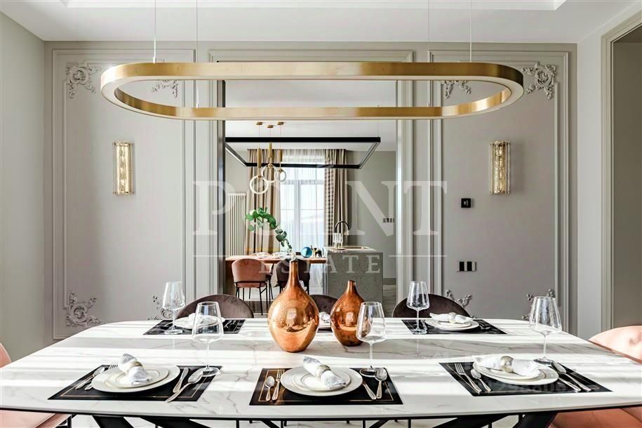 Лот: 98454. Стильный двухэтажный загородный дом площадью 610 кв.м построен на участке 17 соток в поселке премиум-класса ''Ренессанс Парк''. Выполнен дизайнерский ремонт из качественных натуральных отделочных материалов, техники топ-брендов, встроенной мебели и сантехники ведущих европейских производителей, установлено премиальное освещение. Функциональное зонирование внутреннего пространства отвечает всем современным тенденциям в области дизайна интерьеров. На первом этаже находится гостиная с камином, кухня, столовая, спальня, санузел, гардеробная, холл, котельная, постирочная, прихожая, терраса, гараж на два машино-места. Второй этаж занимают четыре спальни, две из которых с индивидуальными гардеробными и санузлами, санузел, холл, блок для персонала, два балкона.
