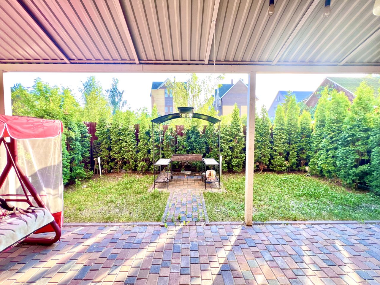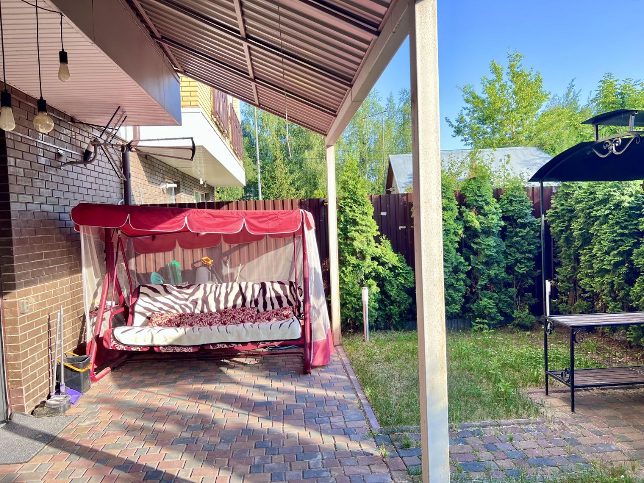 Ухоженная терраса с качелями, креслами и зоной барбекю — это ваш личный оазис под открытым небом. Сад недавно вымощен новой брусчаткой, организовано пространство для уличных ужинов и отдыха.