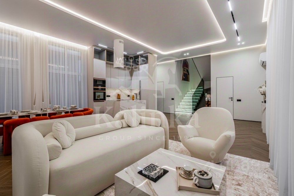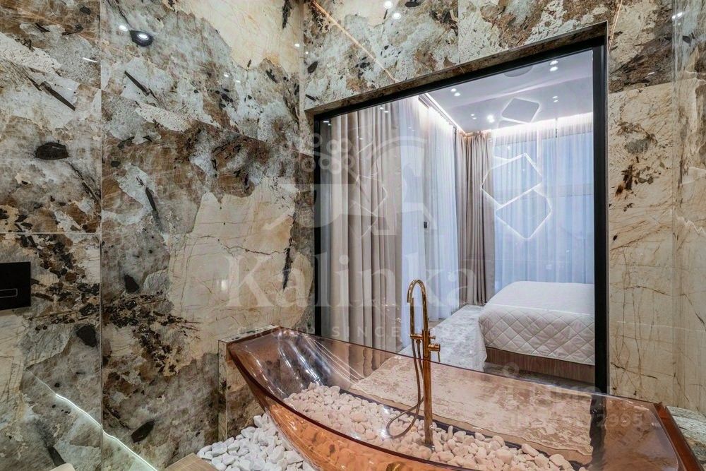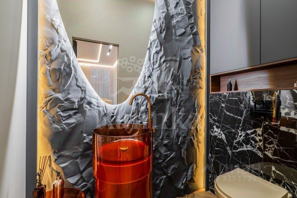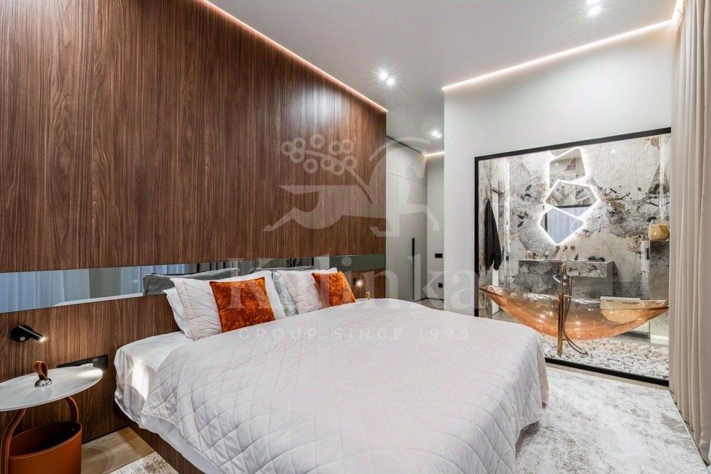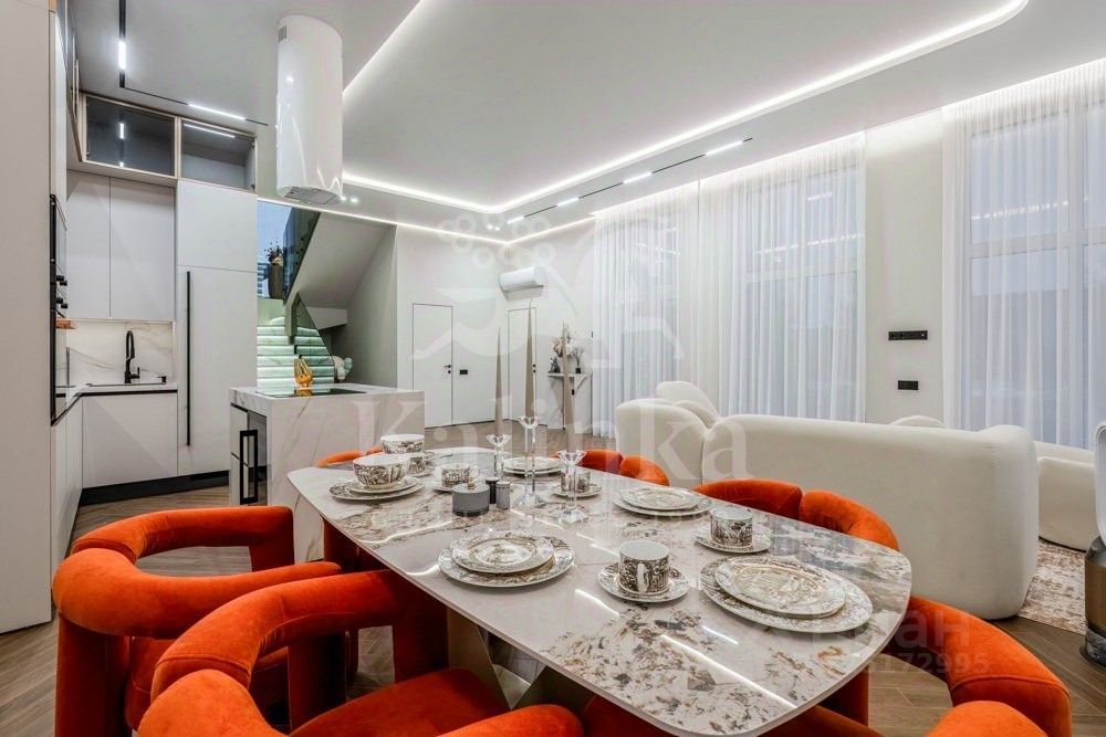 Фасад отделан клинкерным кирпичом, крыша - плоская. Сантехника и смесители от Grohe, Omoikiri, Abber. Установлены два умных унитаза Philips. В ванных комнатах - крупноформатный керамогранит Kerama Marazzi. Премиальная кухонная техника Kuppersbusch. На обеденном столе - сервиз Togas.