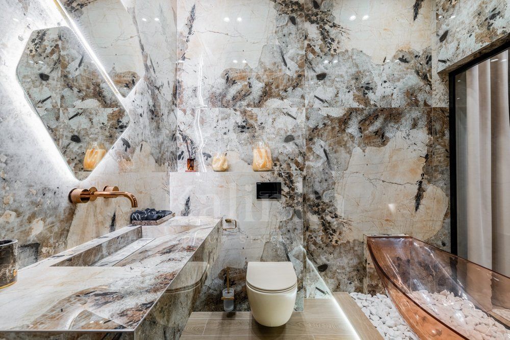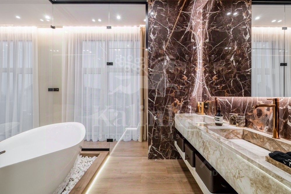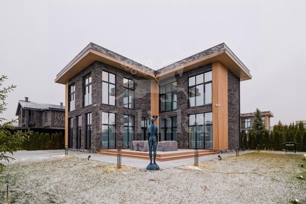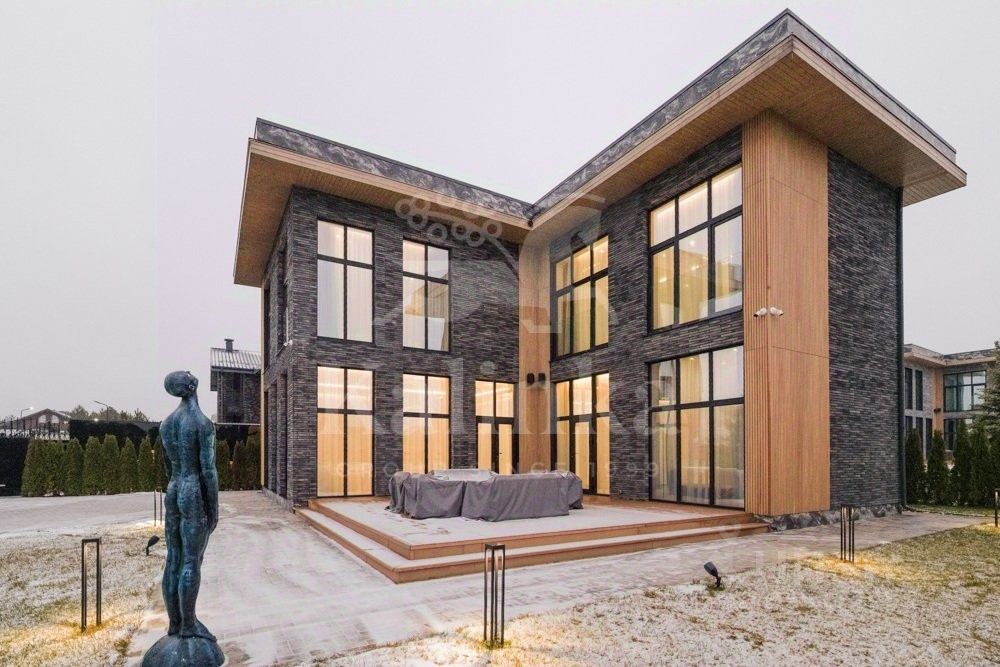 Фасад отделан клинкерным кирпичом, крыша - плоская. Сантехника и смесители от Grohe, Omoikiri, Abber. Установлены два умных унитаза Philips. В ванных комнатах - крупноформатный керамогранит Kerama Marazzi.